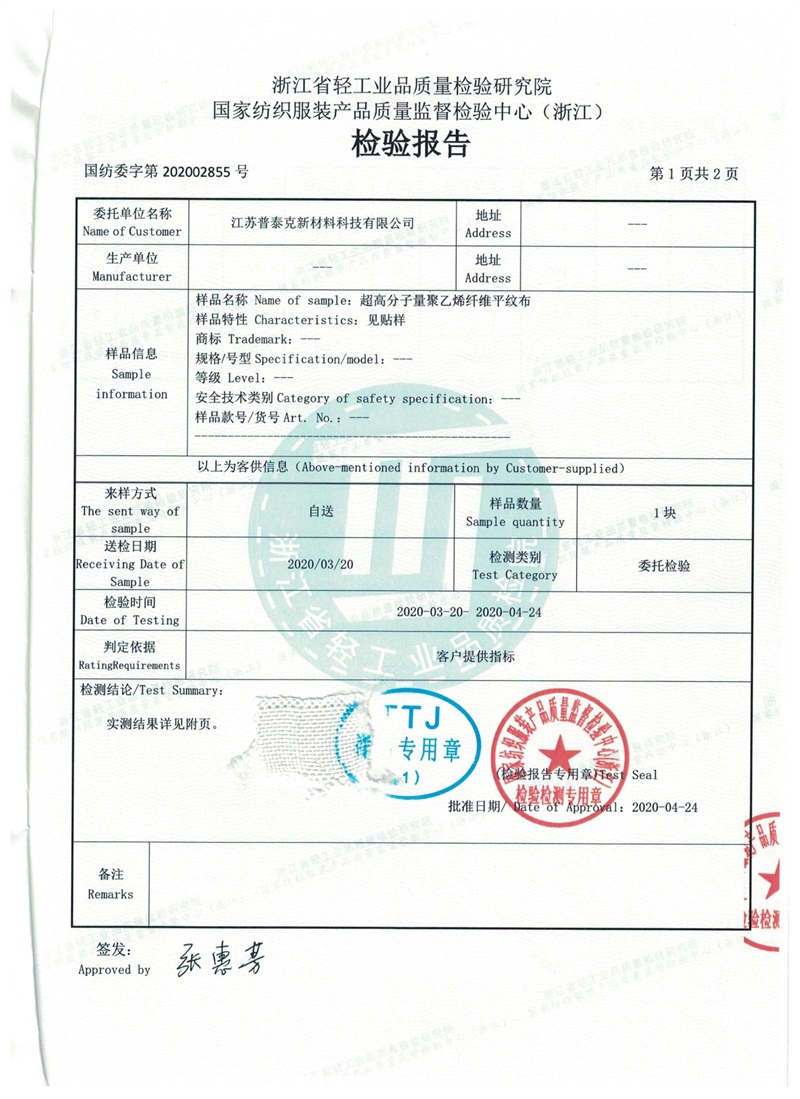 檢測報告-超高分子量聚乙烯平紋布(普泰克)